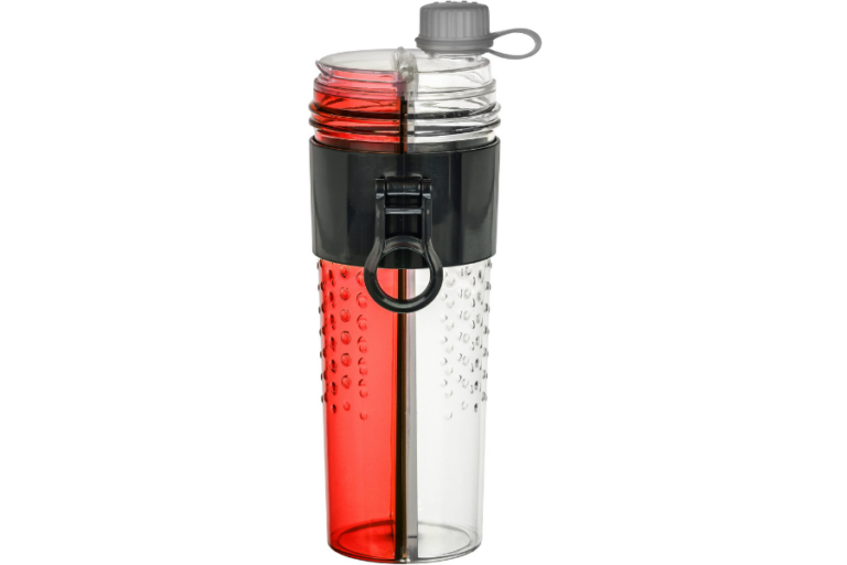 The two components of the bottle are held together with a removable clip which can be removed and then the bottle separates into 2 pieces. This makes it easy for refilling and cleaning or putting in the dishwasher.